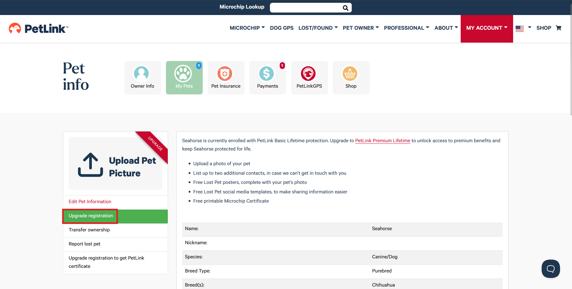 You can also select 'Click here to view pet profile' and select Upgrade registration from your pet's profile