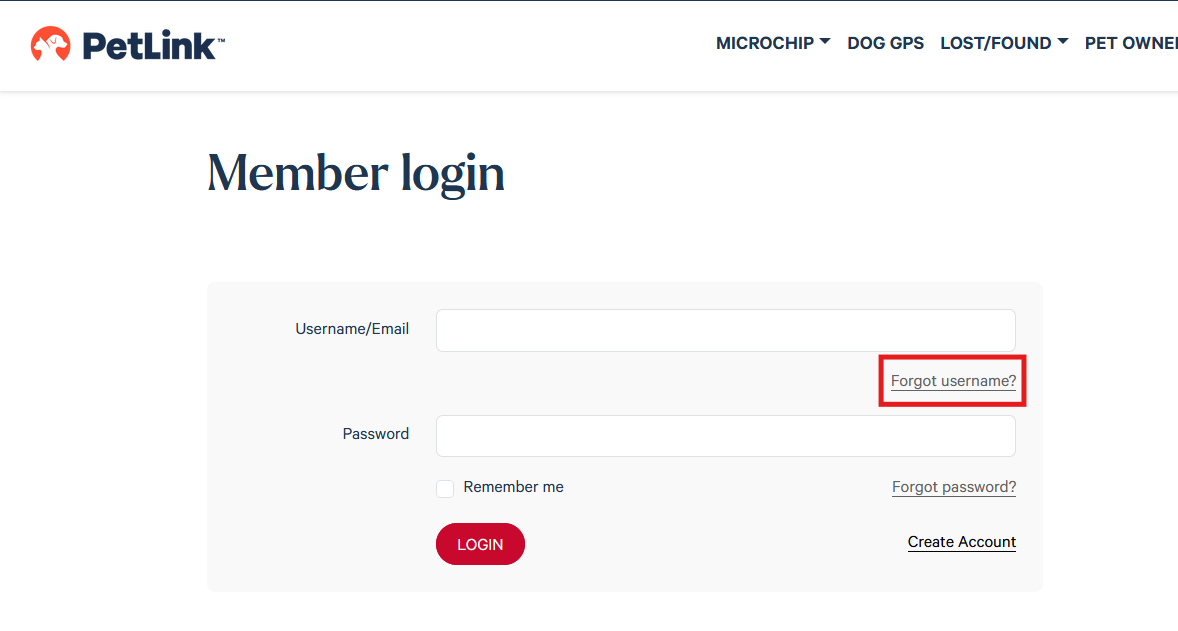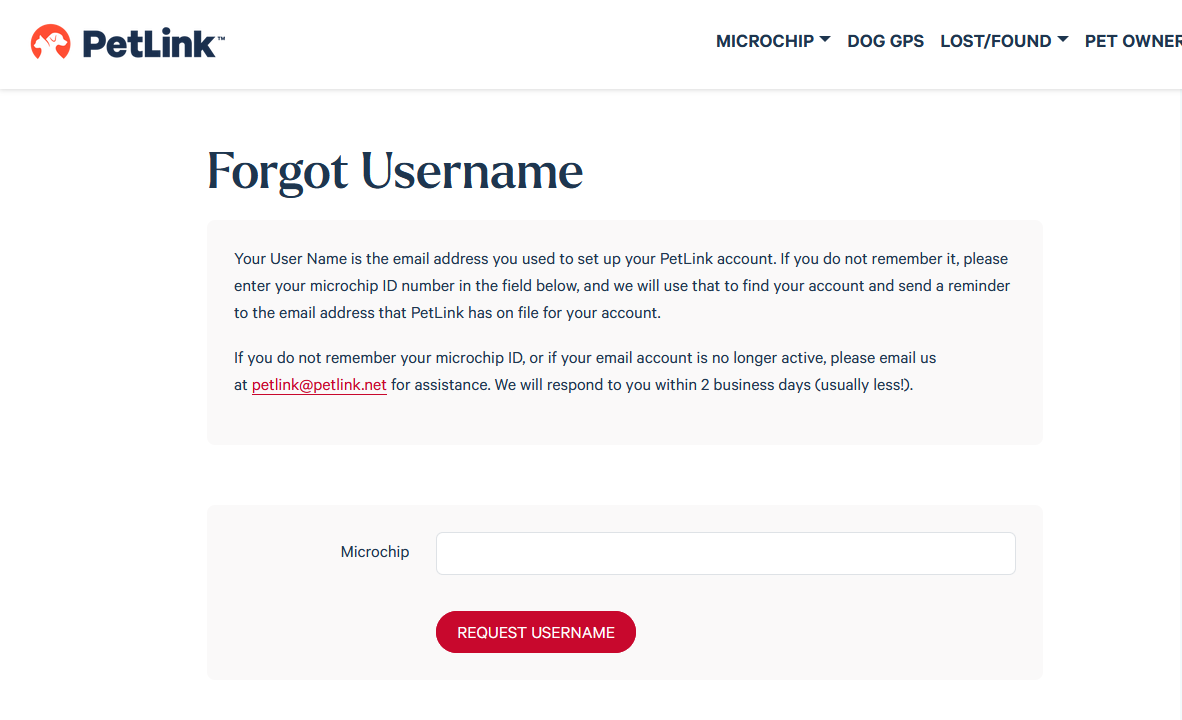 Your username is the email address that you or the implant facility used to set up your PetLink account. If you are unsure of what it is click here.