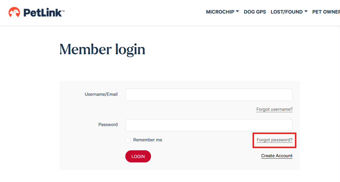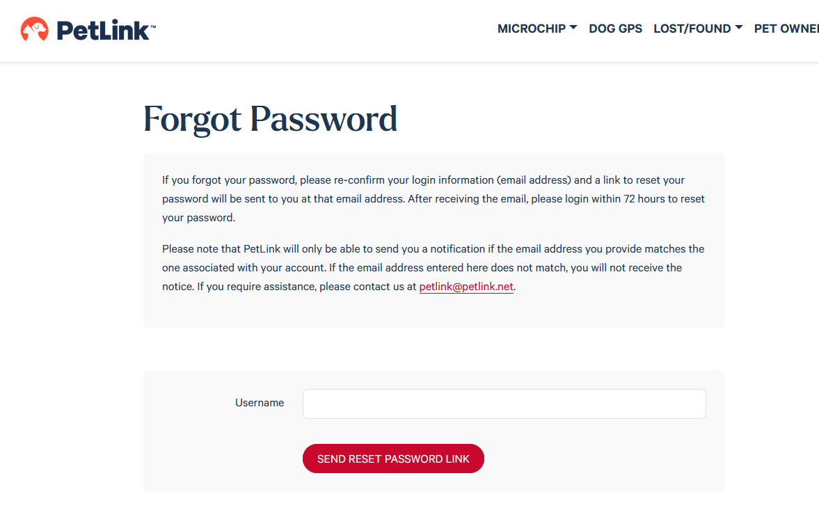 Please note that PetLink will only be able to send you the password reset link if the email address you provide matches the one associated with your account. If the email address entered here does not match, you will not receive the notice and you will need to send an email to petlink@petlink.net for further assistance.