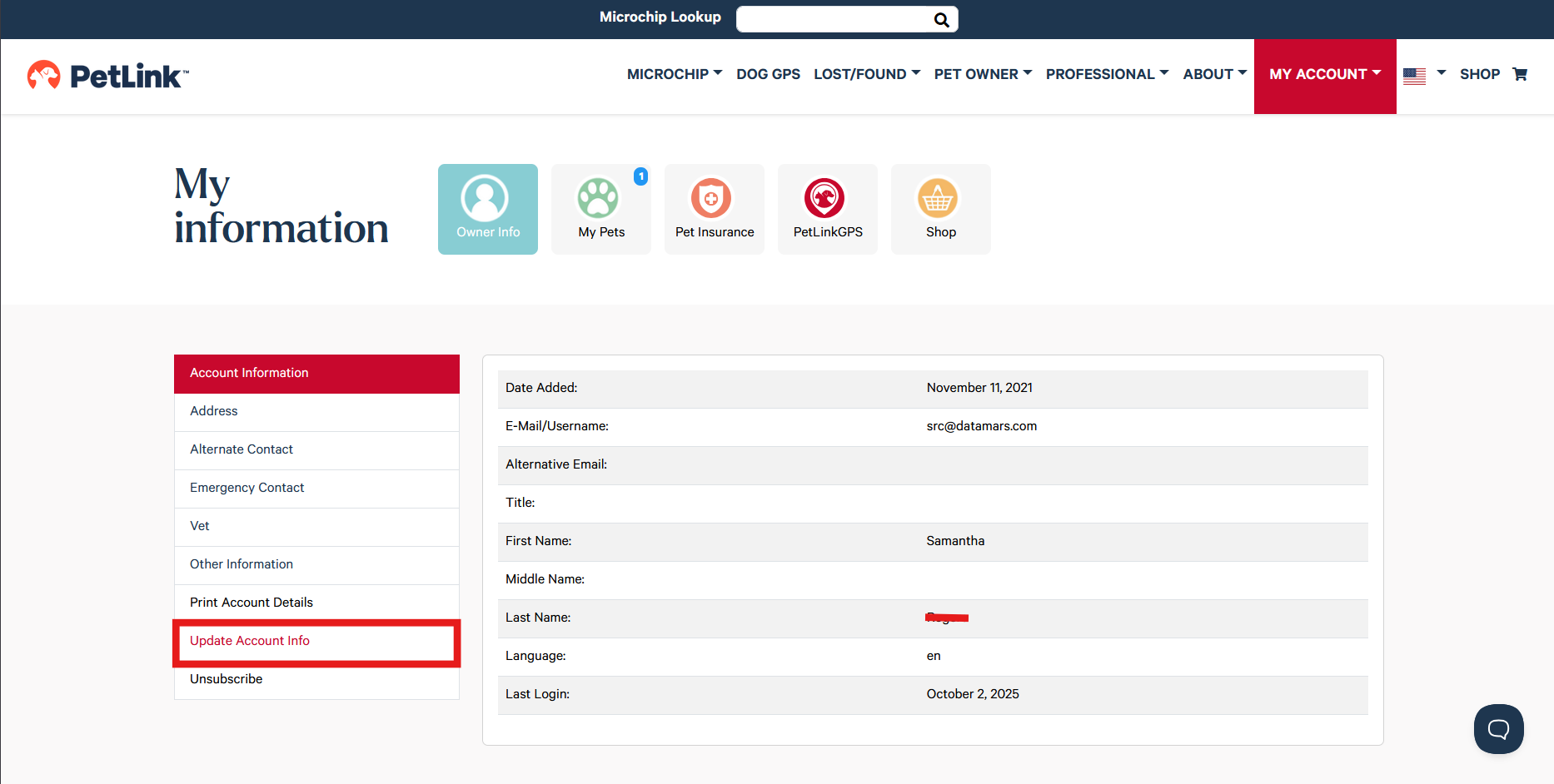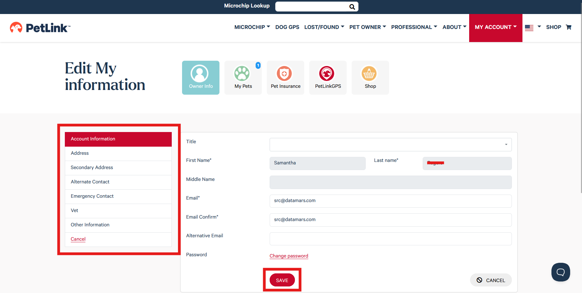 - Select the field you would like to update, enter desired changes and click on the red Save button at the bottom of the page to save your changes