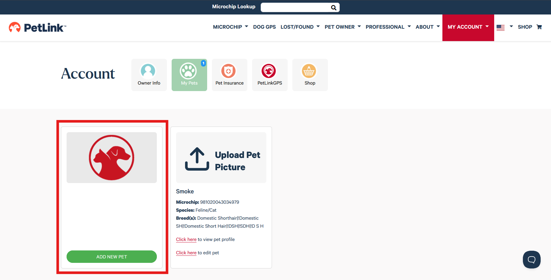 New Account: If you are new to PetLink and are registering a pet for the first time, please click here to get started. Once your account is setup you may register as many pets as you wish on that account.