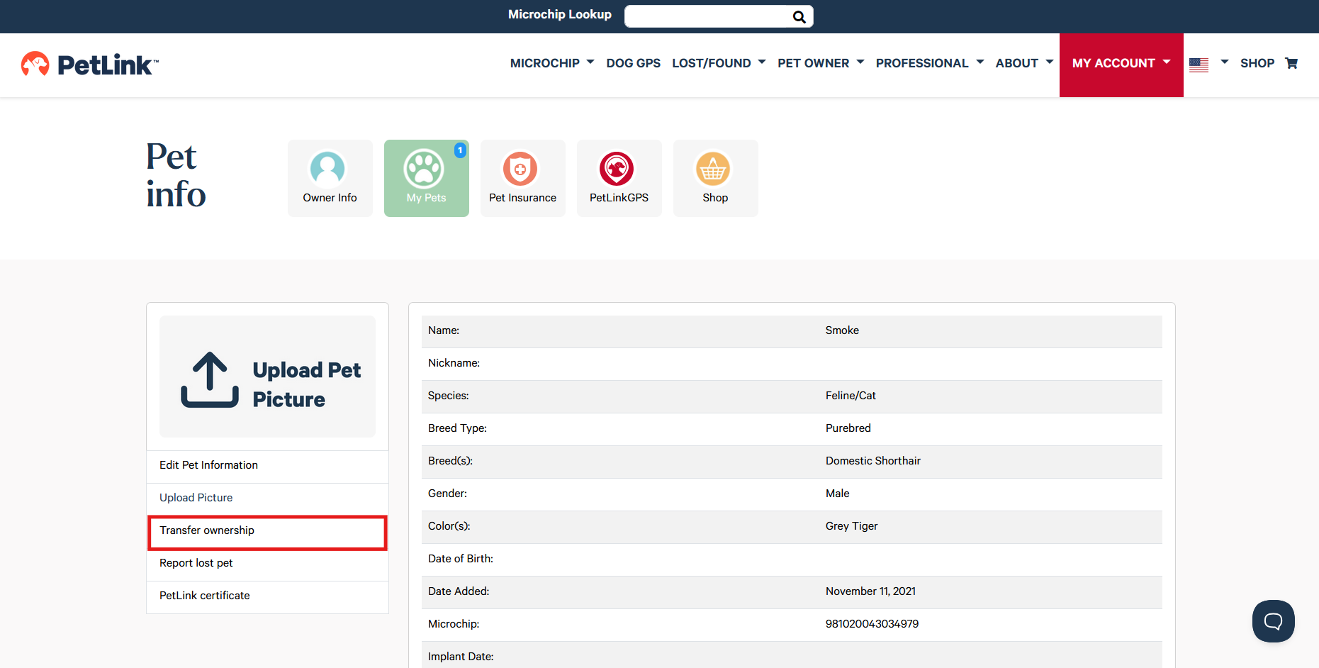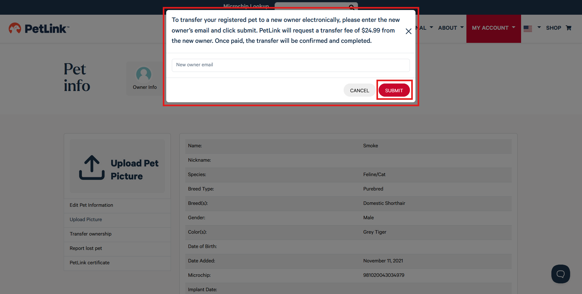 **PetLink will email the new owner and they will have 14 days to accept the transfer request. Once they confirm, the pet will be removed from your account and you will receive an email notification**