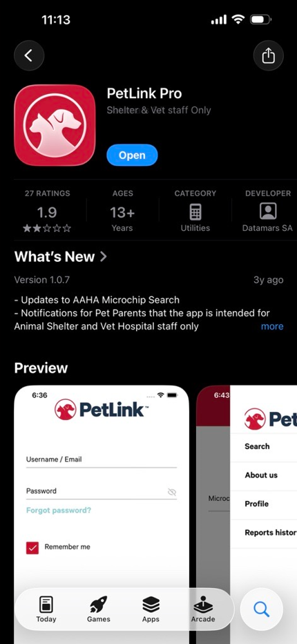 The PetLink Pro app available for download on Apple or Android devices is for US Animal Professionals (ACOs and Shelter staff) ONLY to use in the field.