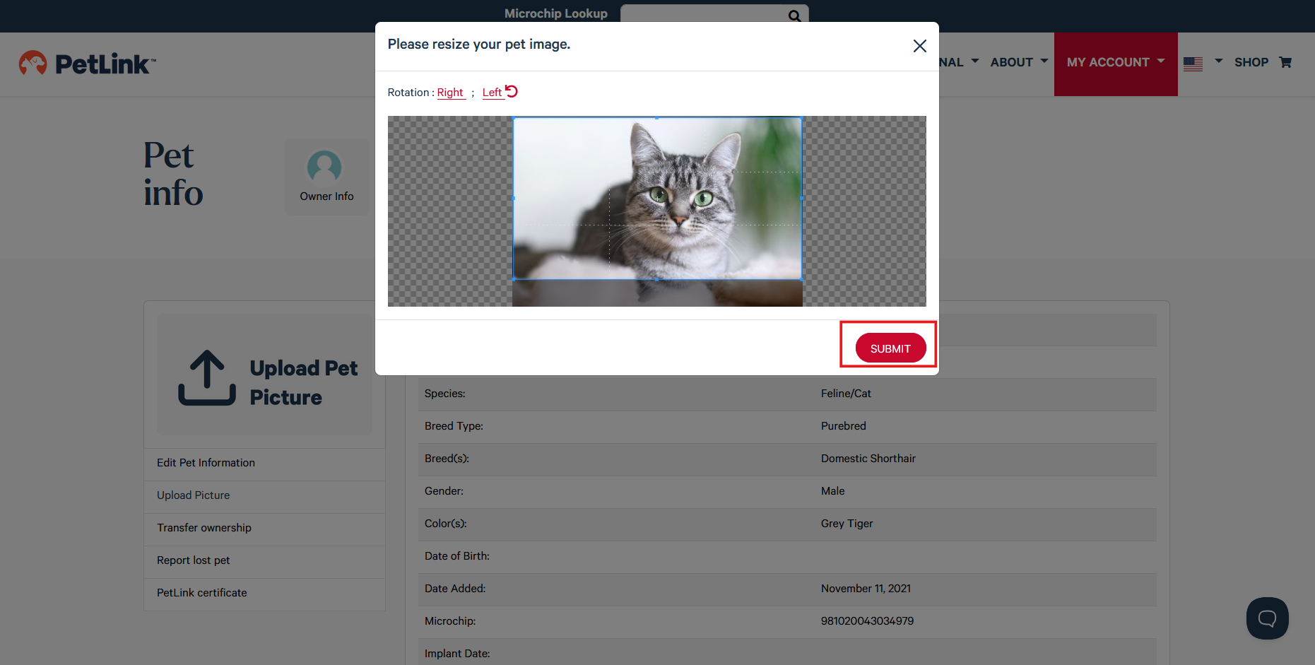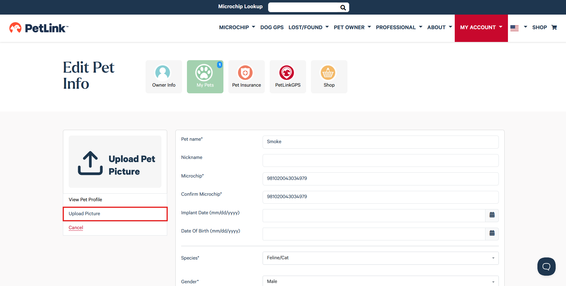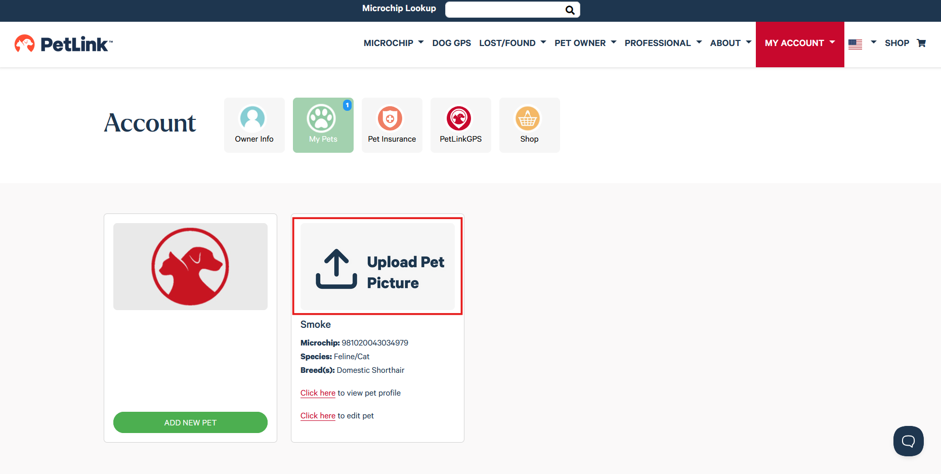Having a picture of your pet uploaded to PetLink helps you take advantage of the full suite of lost pet services. If you have premium lifetime registration you can upload a single picture of your pet to your account