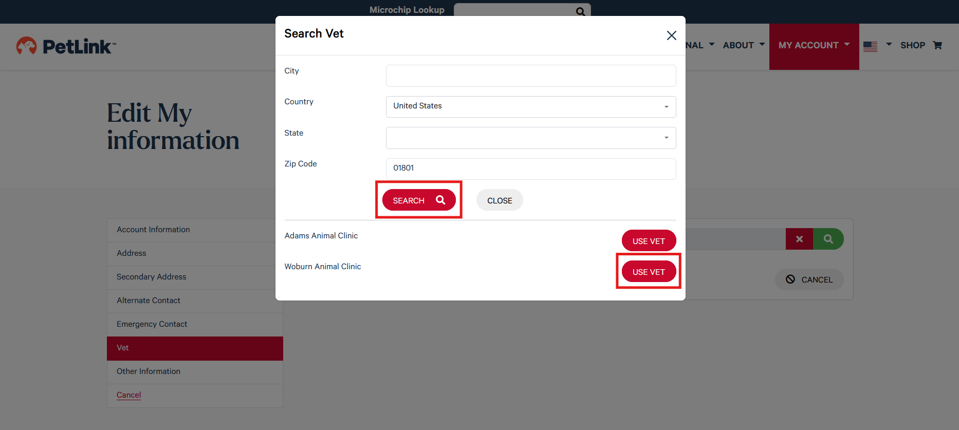 • Enter your vet’s information (city, state and/or zip code) and click Search – if your vet is registered, click on Use Vet