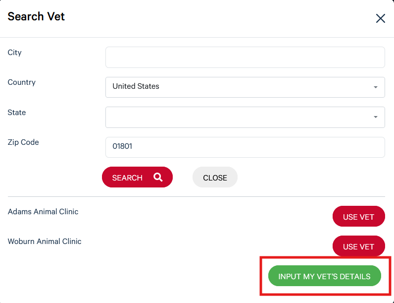 • Enter your vet’s information (city, state and/or zip code) and click Search – if your vet is not listed, click on Input My Vet's Details