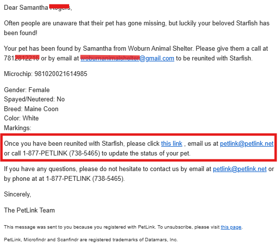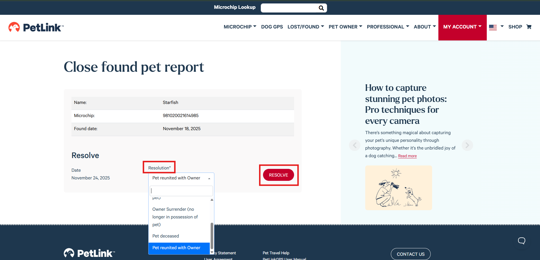 The easiest way to close your found pet report is to use the link in the email notice you received to log into your account and select the appropriate Resolution