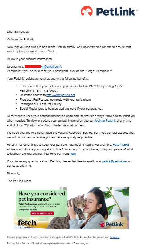 After completing your enrollment you will receive a Welcome to PetLink confirmation email from us outlining what is included in your registration.